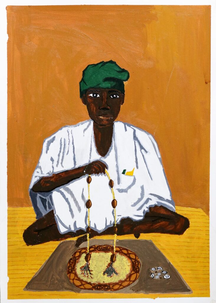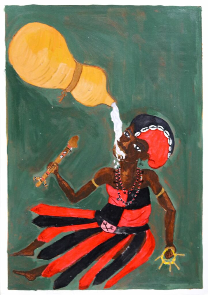 Por isso, trago uma série de pinturas feitas em tinta acrílica de uma recente pesquisa sobre o Erindilogun, o Jogo de Búzios. Onde começo contando sobre um dos itans da criação do jogo. Nesta série de pinturas registro e retrato os principais personagens desse itan que irá mostrar como Osún teve que usar de todas as suas artimanhas para convencer Orunmila e sucessivamente Esú a ensinar-lhes o oráculo que permitiria a comunicação entre humanos e Orixás.