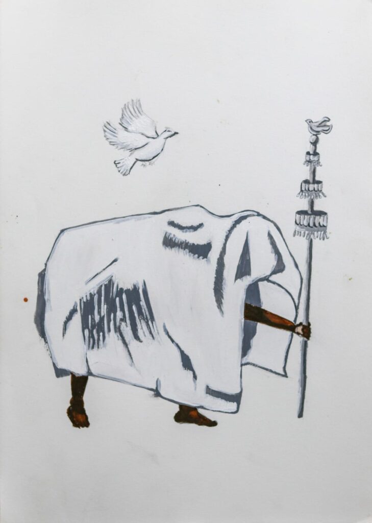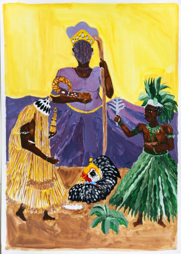 O terceiro retrato, é uma cena onde estão Obaluayê, Nanã e Osanyin em ritual iniciando e entregando seus conhecimentos ao novo iniciado aqui representado pela cabeça da galinha d’angola.